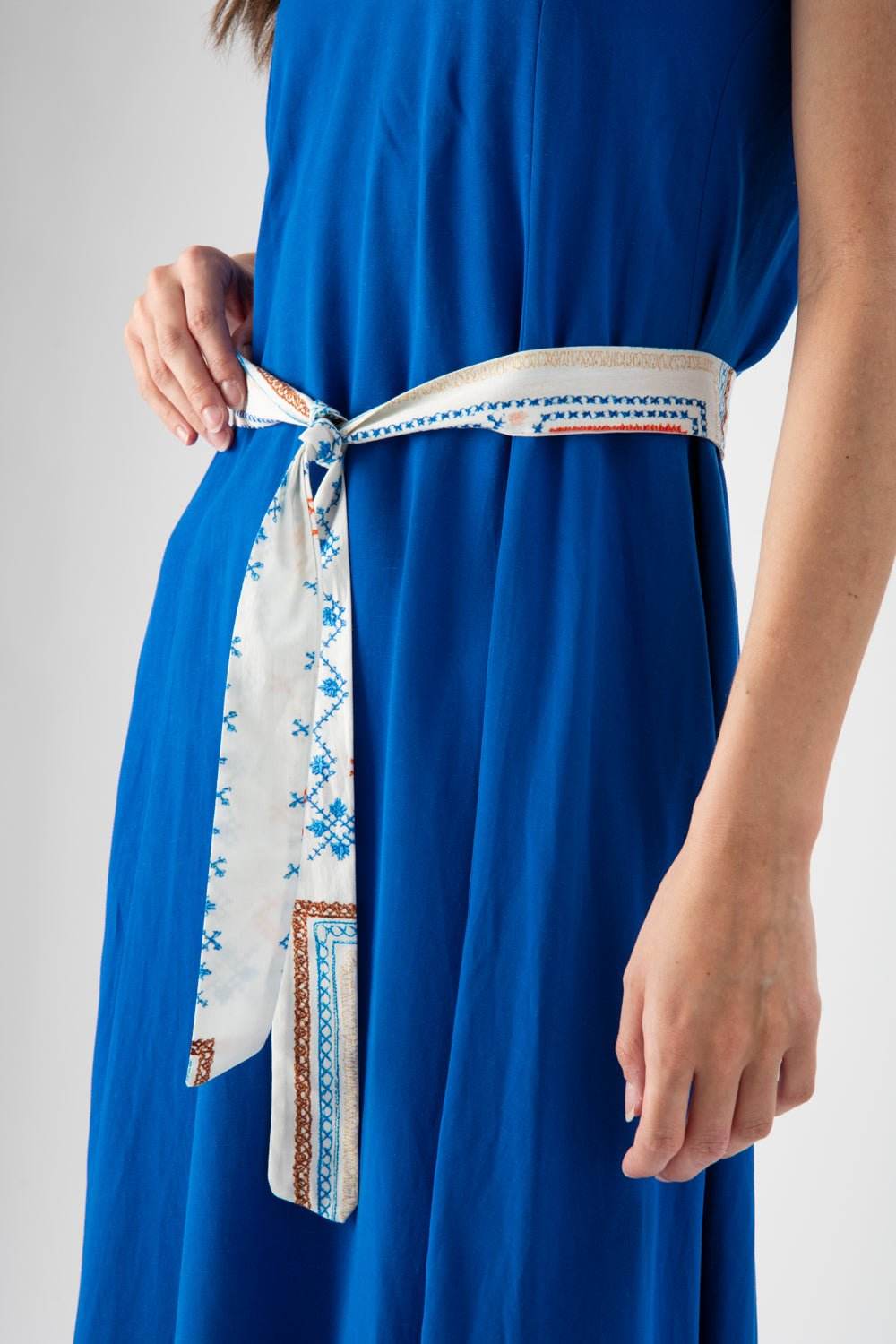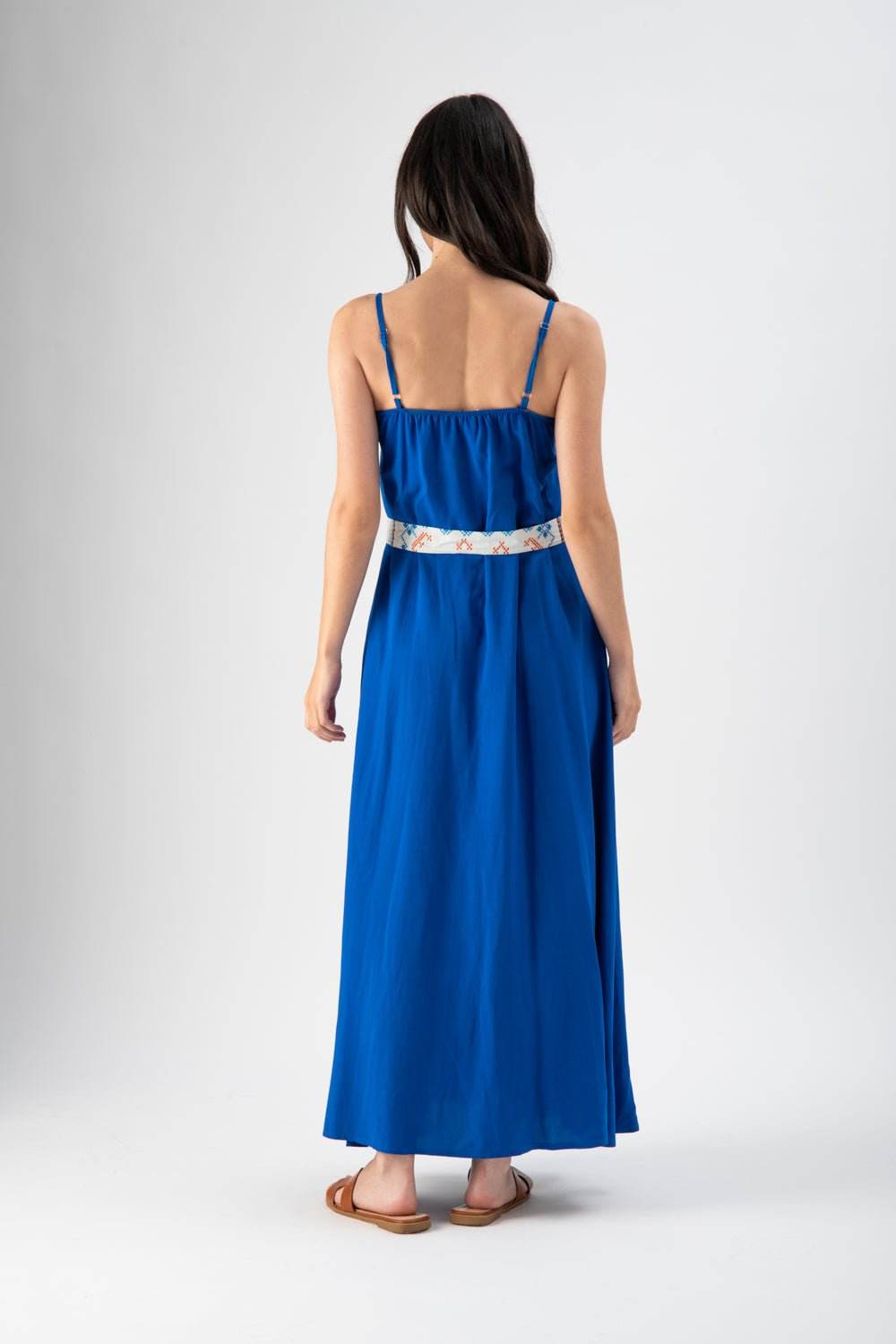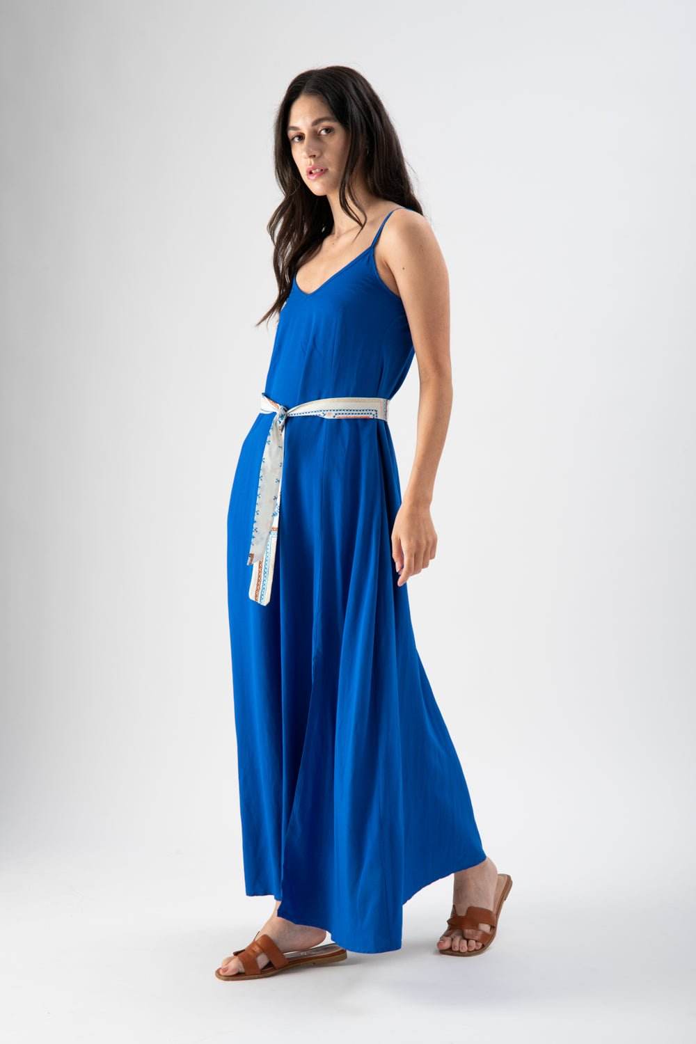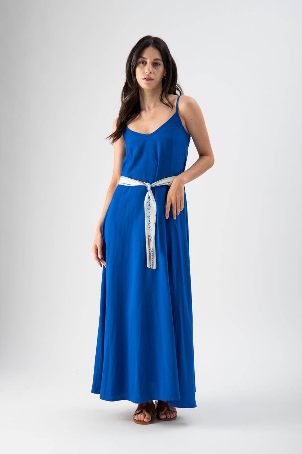 Abito lungo in misto lino con spalline sottili e fusciacca in fantasia