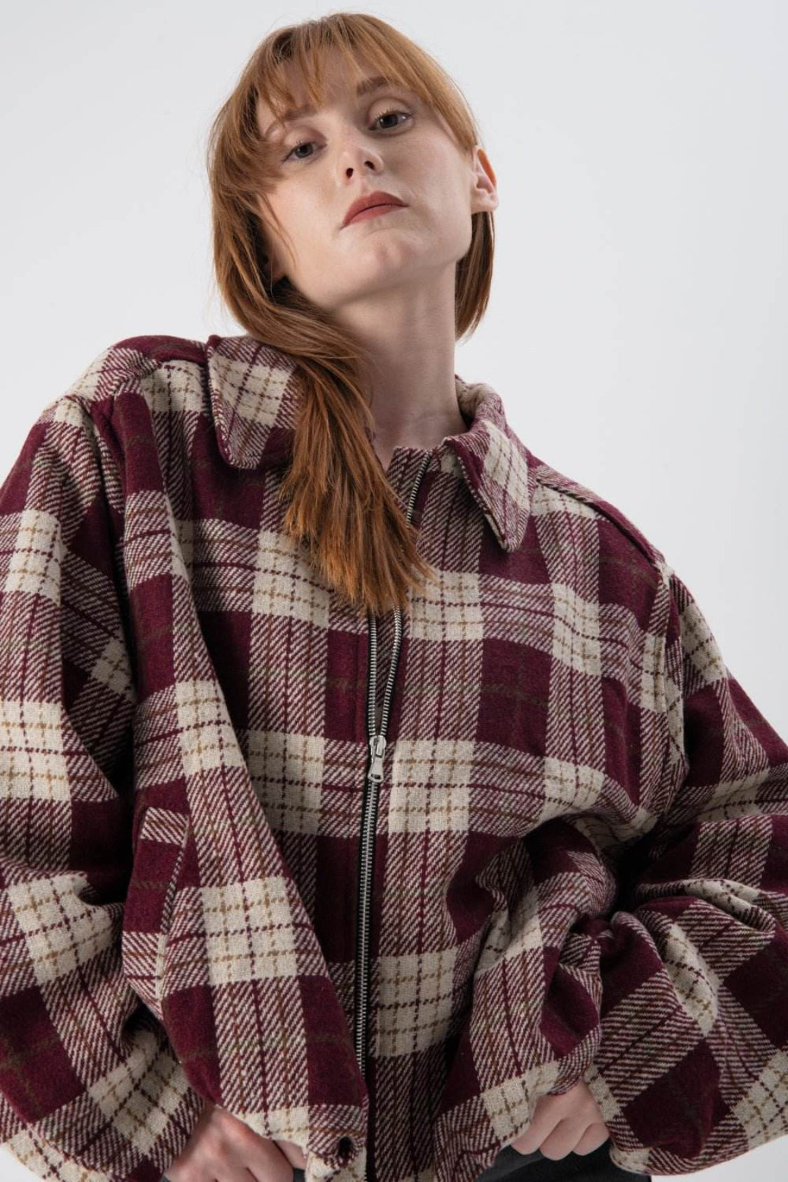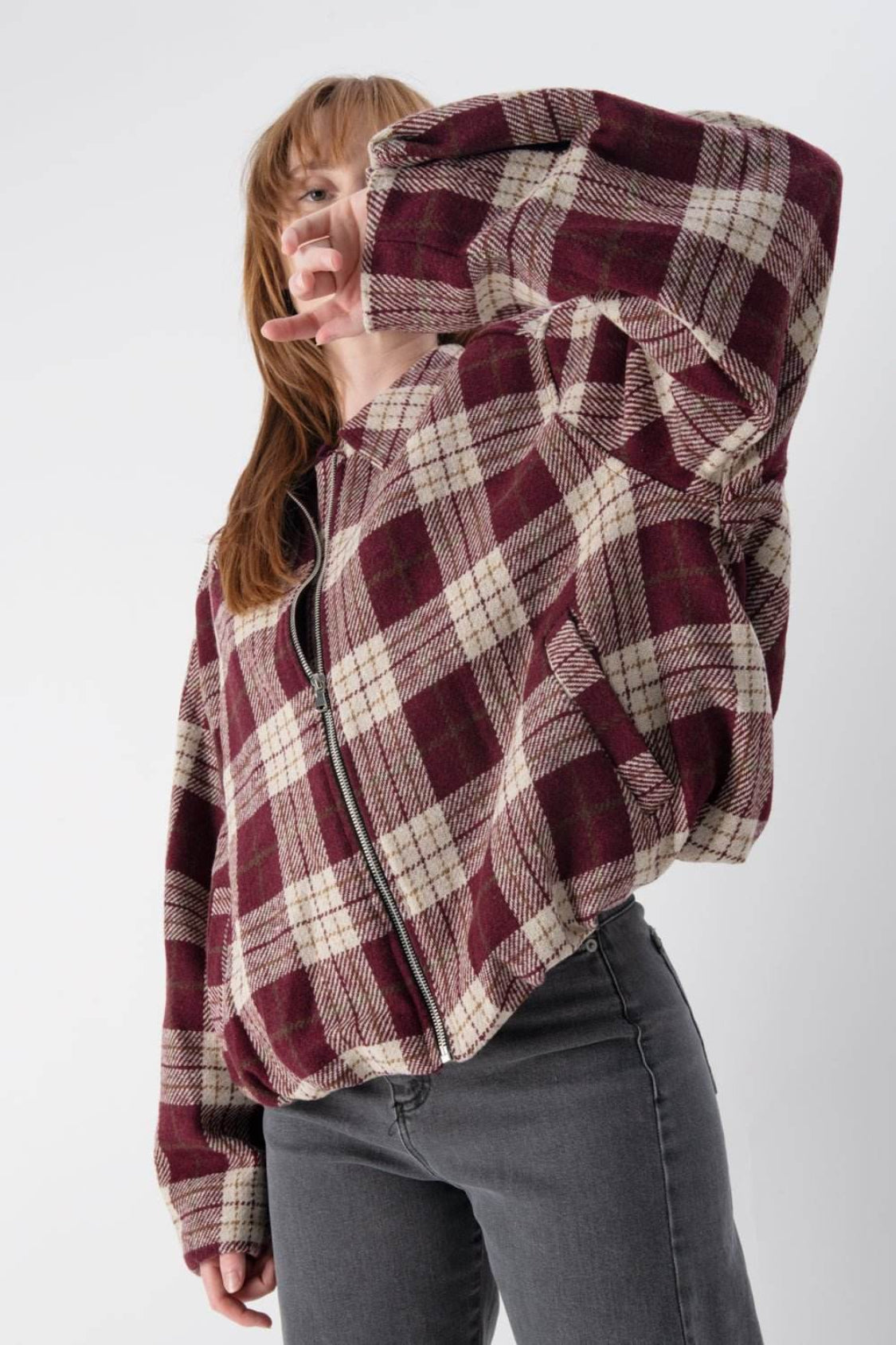 Bomber con motivo a quadri con colle a revers, arricciature sul fondo e chiusura frontale con cerniera metallica.