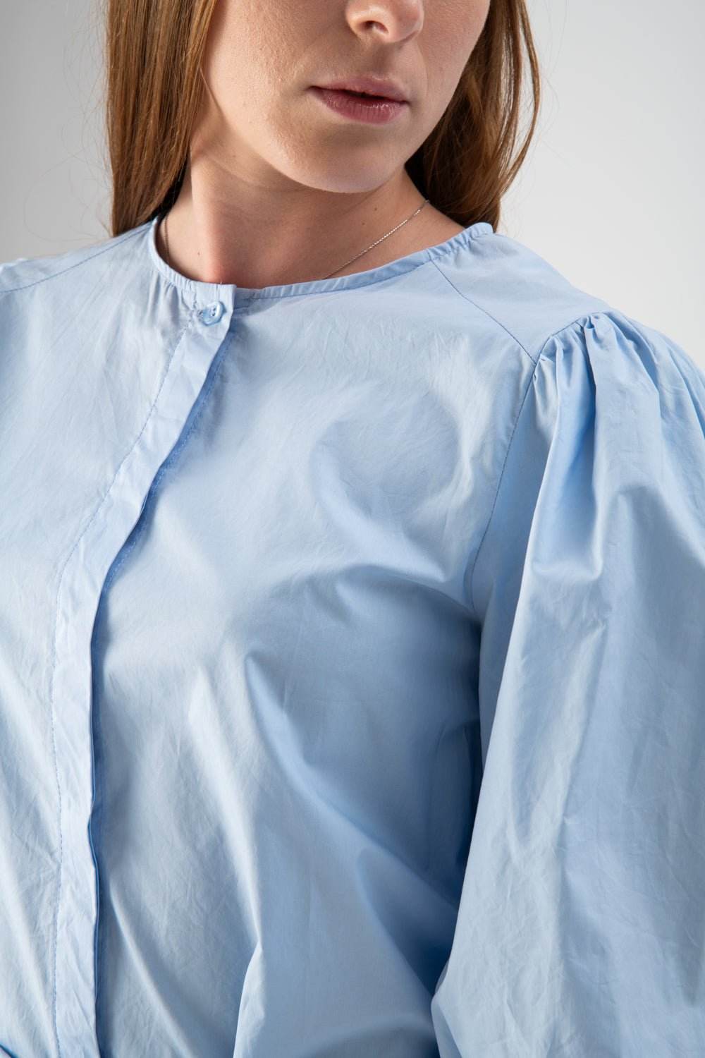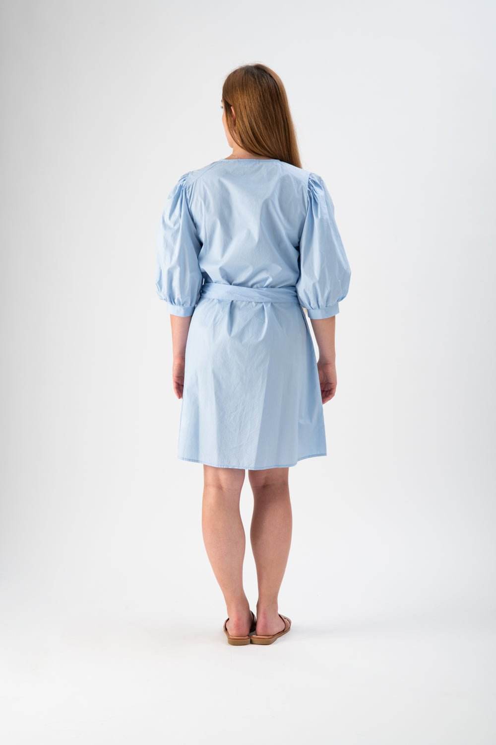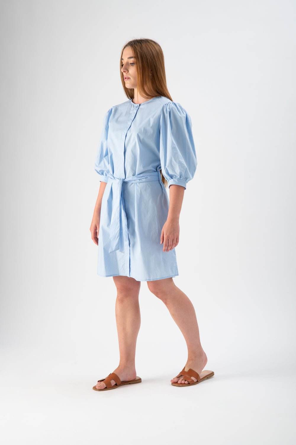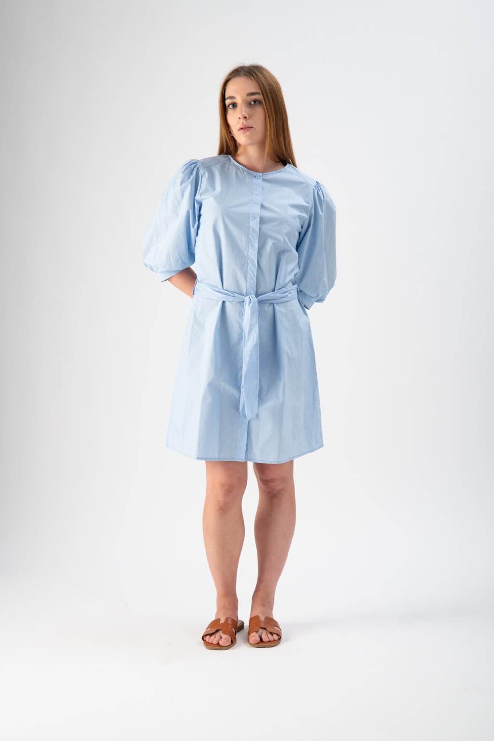 Abito corto in popeline con fusciacca in vita e maniche a palloncino
