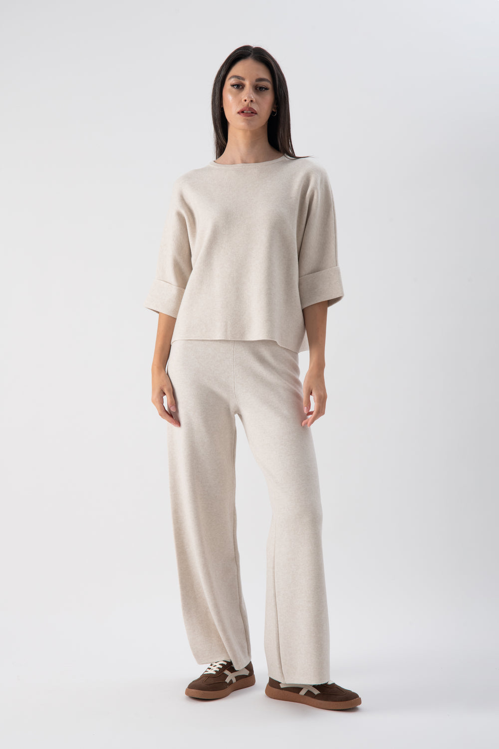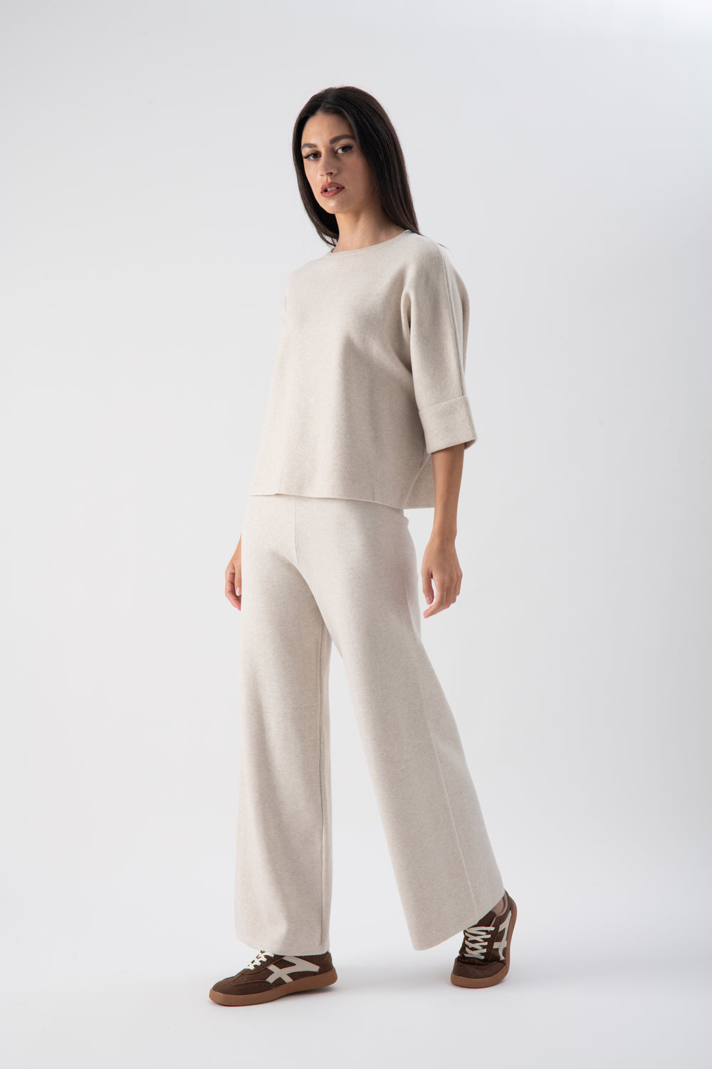 Coordinato morbido in viscosa composto di maglia strutturata con risvolto su maniche a 3/4 e scollo rotondo e pantalone morbido a gamba dritta con elastico in vita