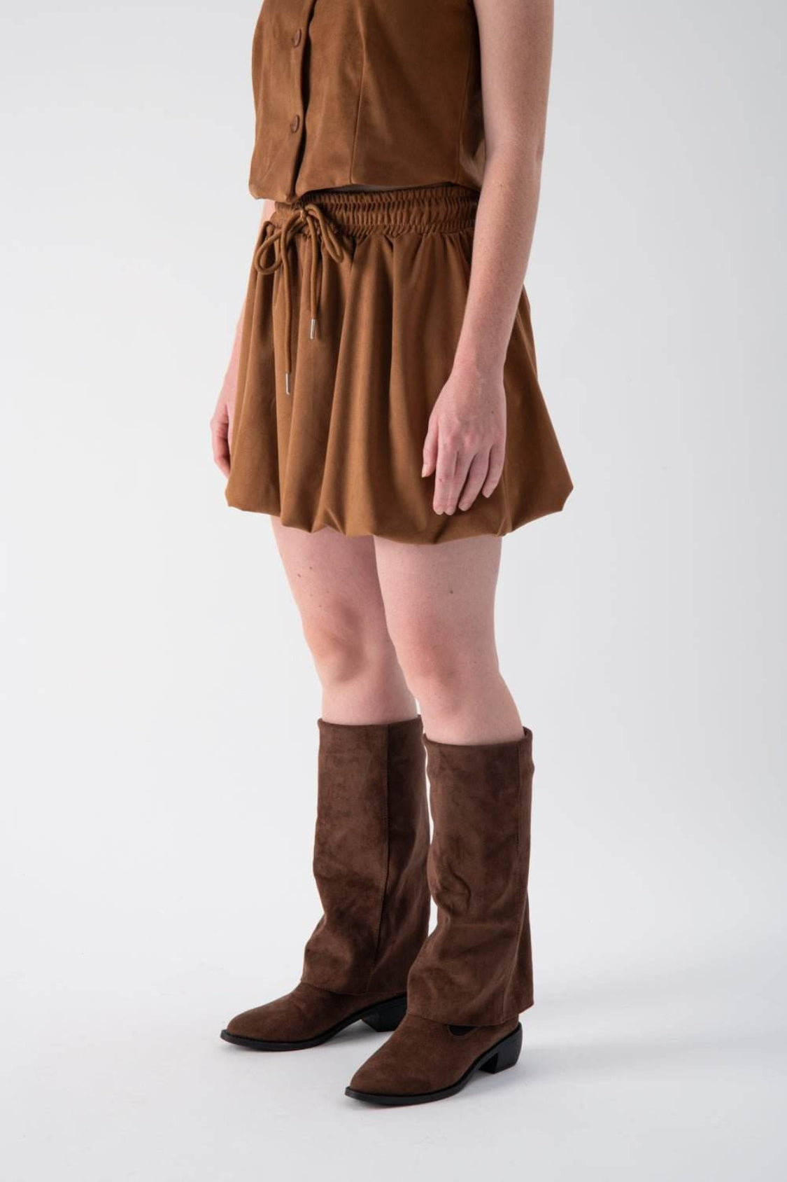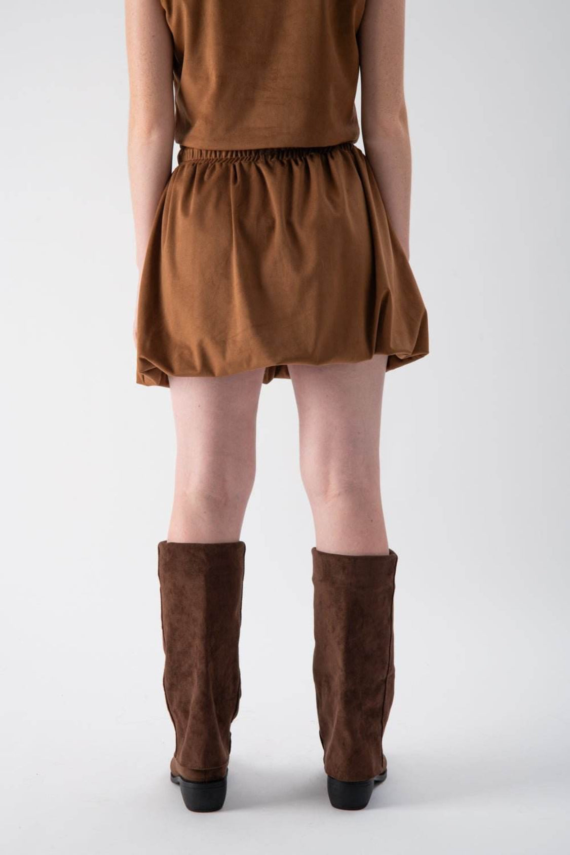 La gonna scamosciata a palloncino in morbido suede, capo d'abbigliamento versatile e alla moda, perfetto per creare outfit sofisticati e glamour. Realizzata in morbida pelle scamosciata, questa gonna presenta una silhouette a palloncino che dona un tocco di femminilità ad ogni look.