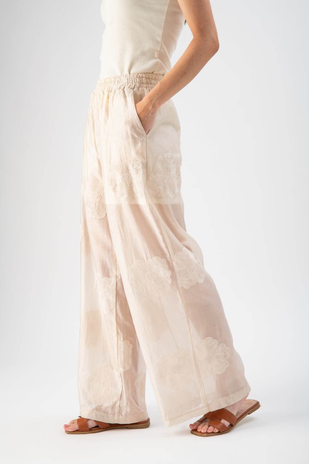 Pantaloni in lyocell velati con sottoveste e ricami floreali